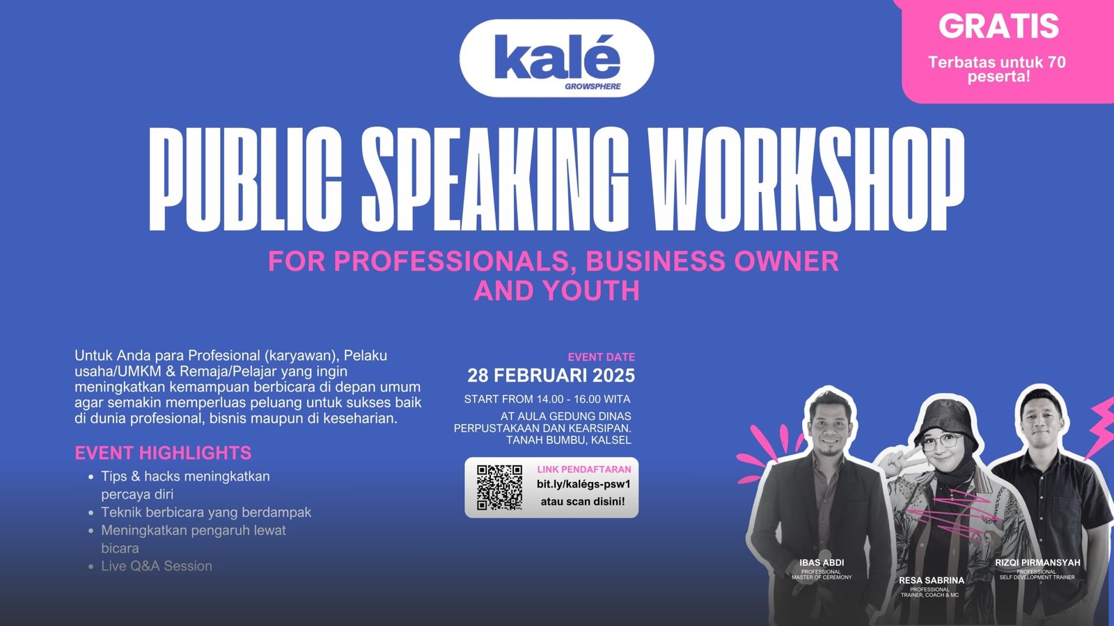 RakyatTalk, Tanah Bumbu – Kale Growsphere akan mengadakan workshop public speaking gratis untuk 70 peserta dengan tujuan meningkatkan kemampuan berbicara di depan umum.