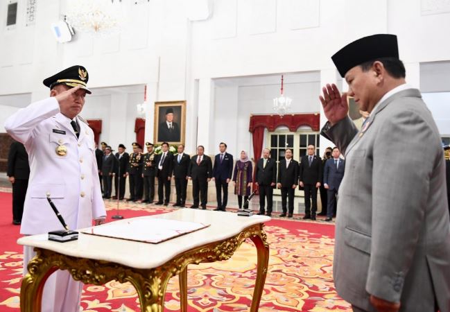 “Saya bersumpah akan memenuhi kewajiban saya sebagai gubernur dengan sebaik-baiknya dan seadil-adilnya, memegang teguh Undang-Undang Dasar Negara Republik Indonesia Tahun 1945 dan menjalankan segala undang-undang, dan peraturannya dengan selurus-lurusnya serta berbakti kepada masyarakat, nusa, dan bangsa,” ucap Presiden Prabowo membacakan penggalan sumpah jabatan.